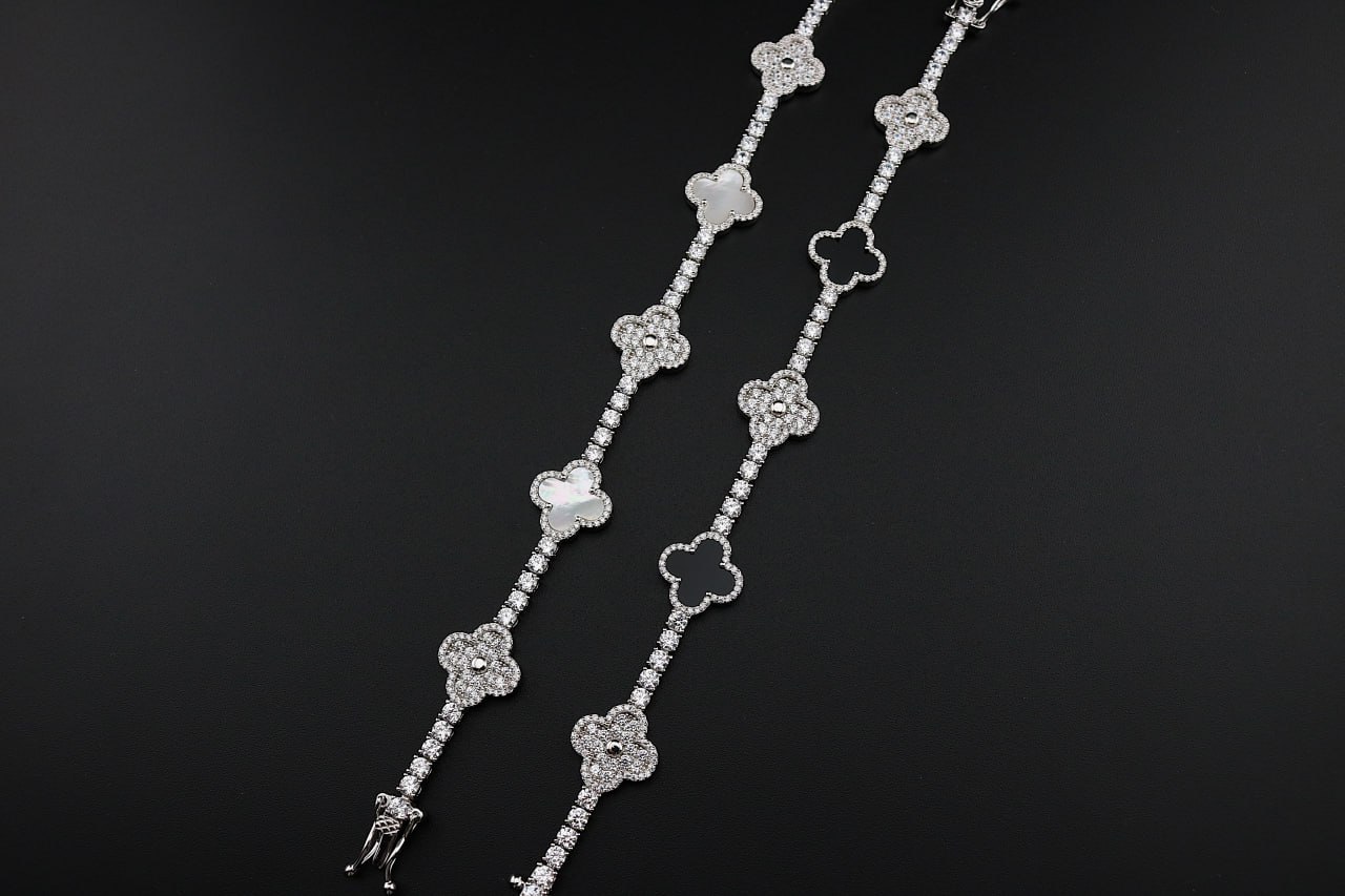 دستبند نقره ونکلیف تراش سفید و مشکی سه گل زنانه